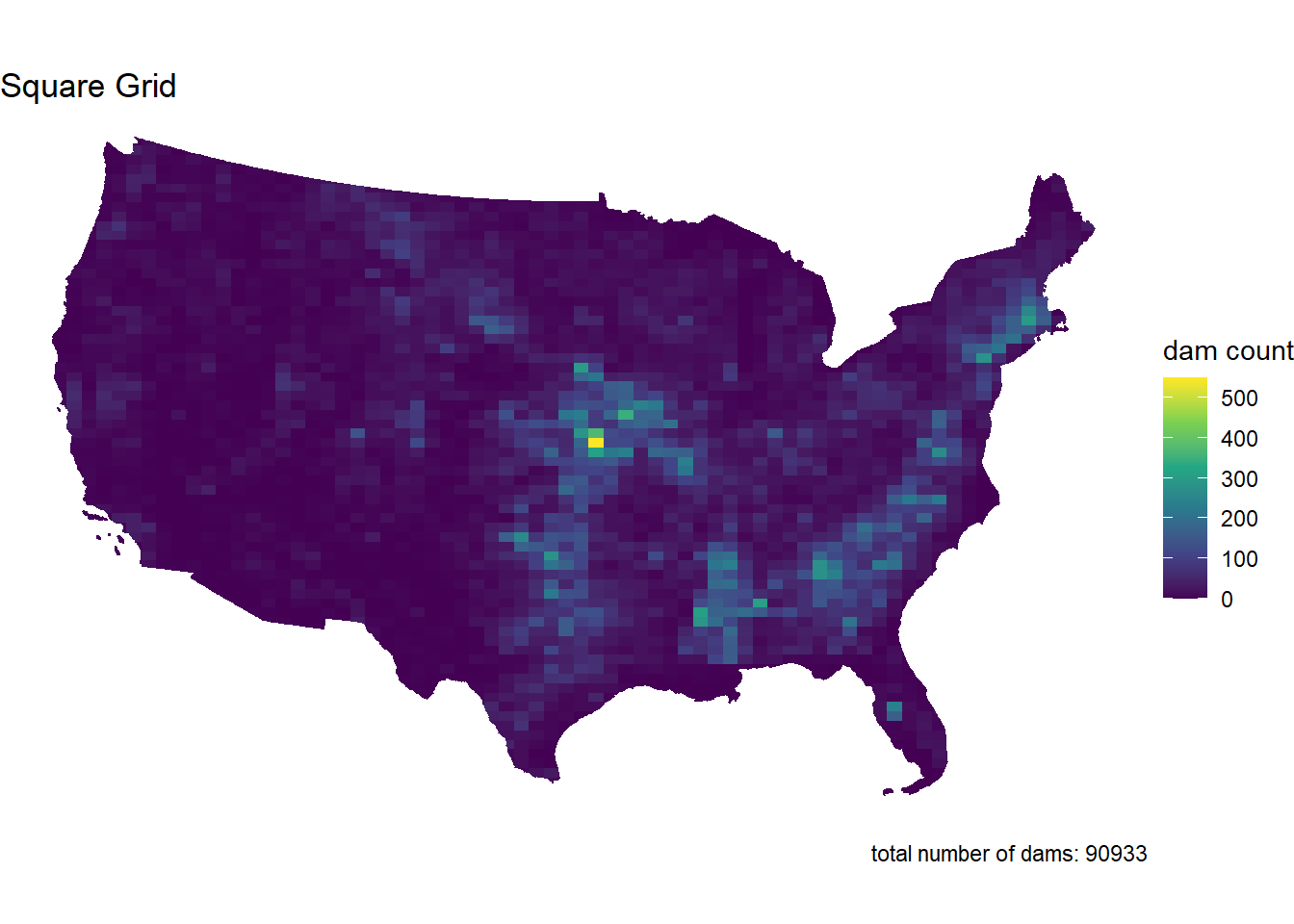 dam_plot(dams_grid, "Square Grid")