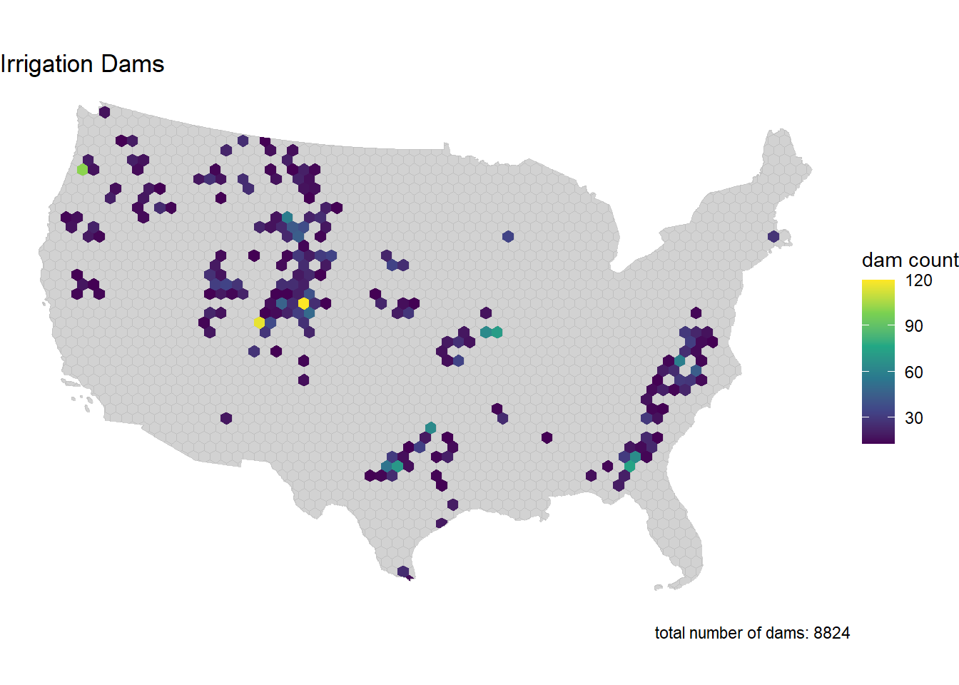 dam_plot(dams_i_hex, "Irrigation Dams") +