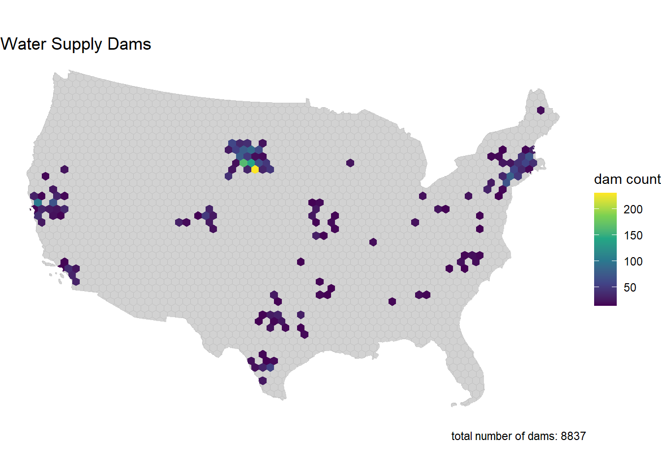dam_plot(dams_s_hex, "Water Supply Dams") +