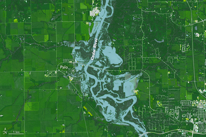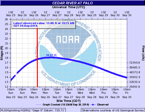 On September 26, 2016 at 11:47 a.m. U.S. Central Daylight Time (16:47 UTC) the Cedar and Wapsipinicon rivers in Iowa surged producing a flood wave that breached the river banks. The water level of the Cedar River measured ~20 feet — 8 feet above flood stage—near the city of Cedar Rapids.