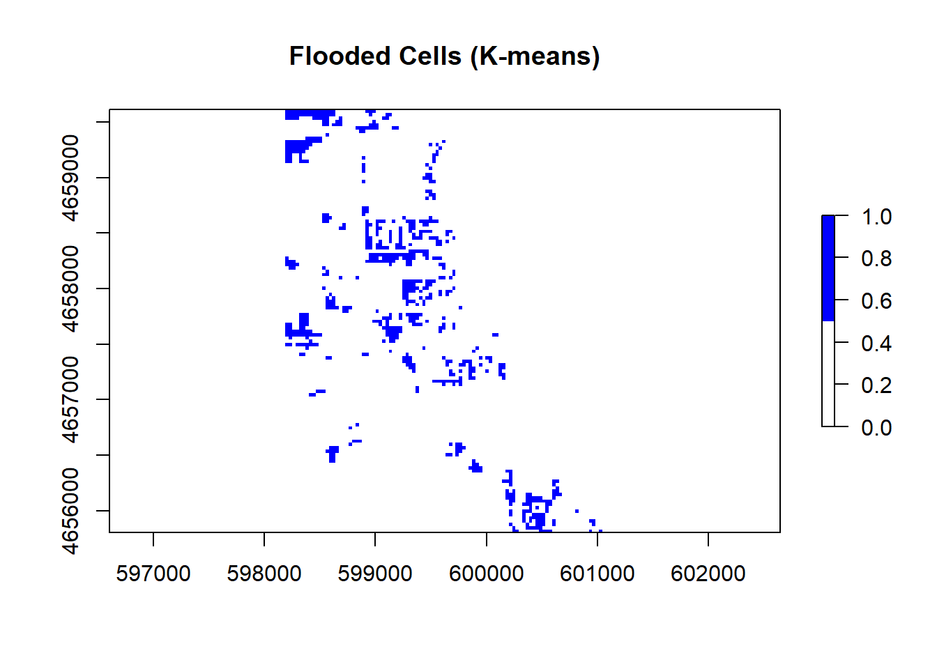 plot(flood_raster, col = c("white", "blue"), main = "Flooded Cells (K-means)")