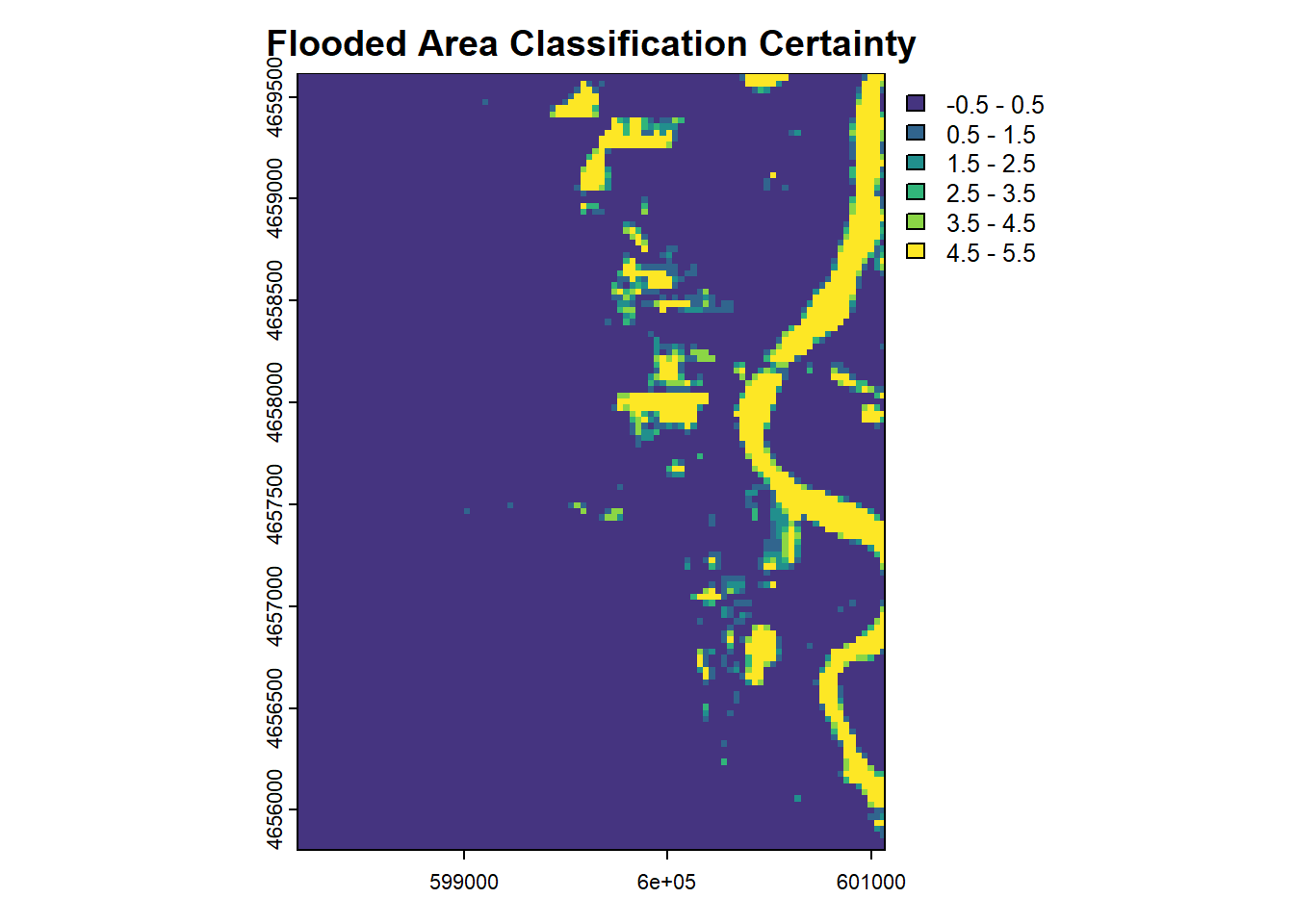 - Second we can visualize the uncertainty in our classifications by summing the entire stack using app. The higher the count in each pixel, the more certain we can be about its flooded state. For example, if a cell has a value of 6, it indicates that every method identified the cell as flooded, if it has a value of 2 then we know that two of the methods identified the cell as flooded.