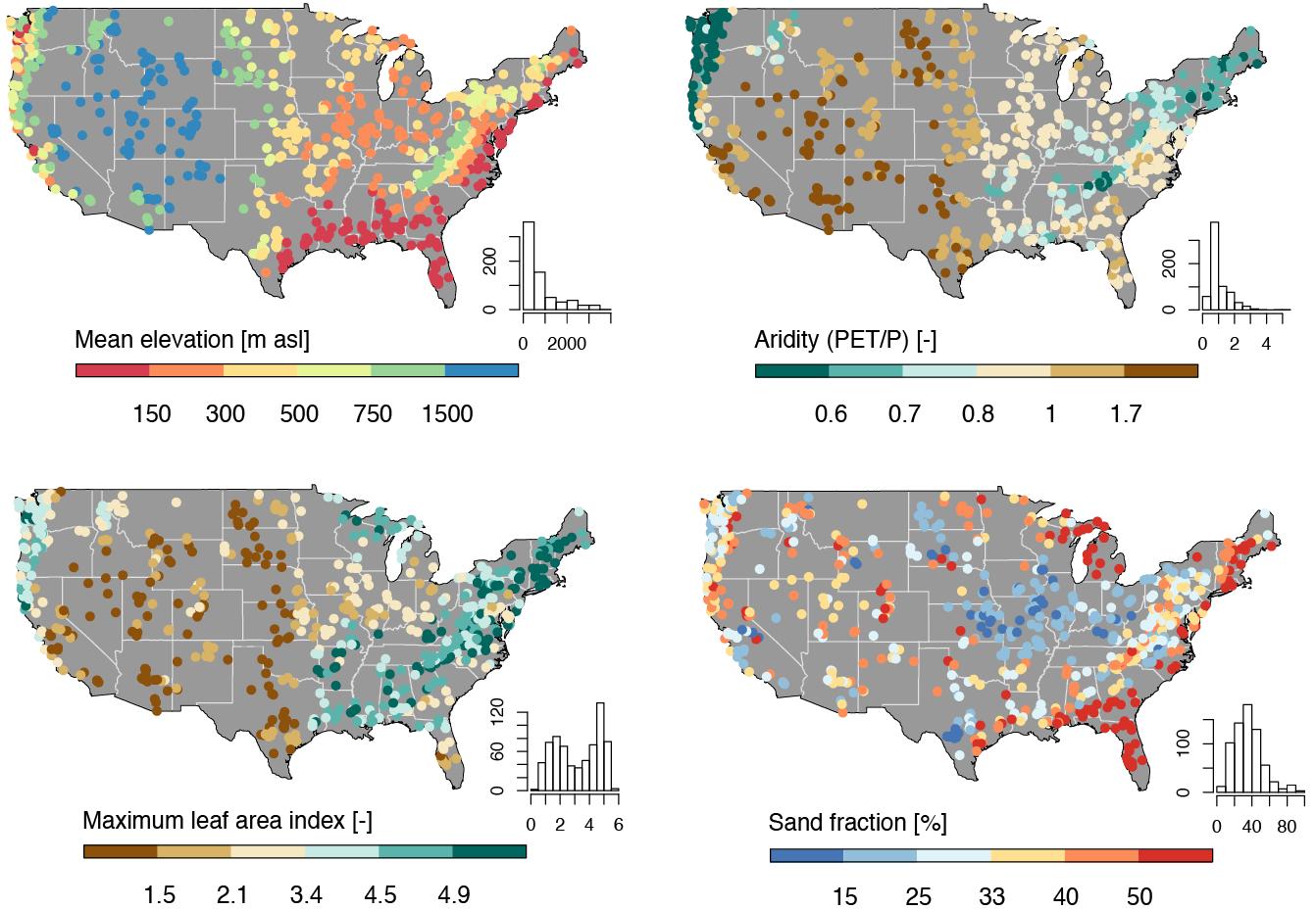 The CAMELS dataset is a widely used resource in hydrology and environmental science, providing data on over 500 self-draining river basins across the United States. It includes meteorological forcings, streamflow observations, and catchment attributes such as land cover, topography, and soil properties. This dataset is particularly valuable for large-sample hydrology studies, enabling researchers to develop and test models across diverse climatic and physiographic conditions.