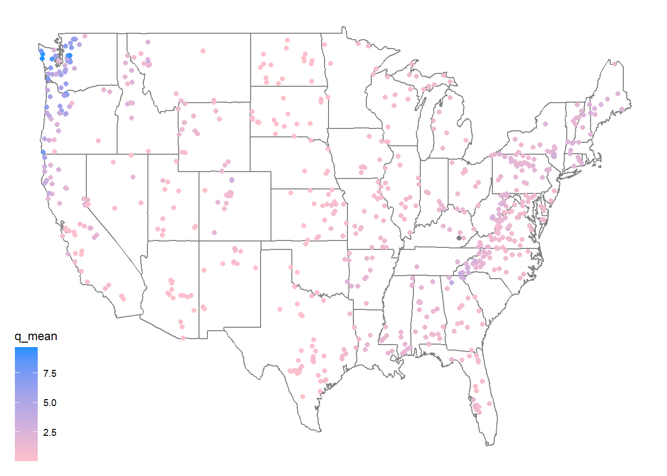 First, lets make a map of the sites. Use the borders() ggplot function to add state boundaries to the map and initially color the points by the mean flow (q_mean) at each site.