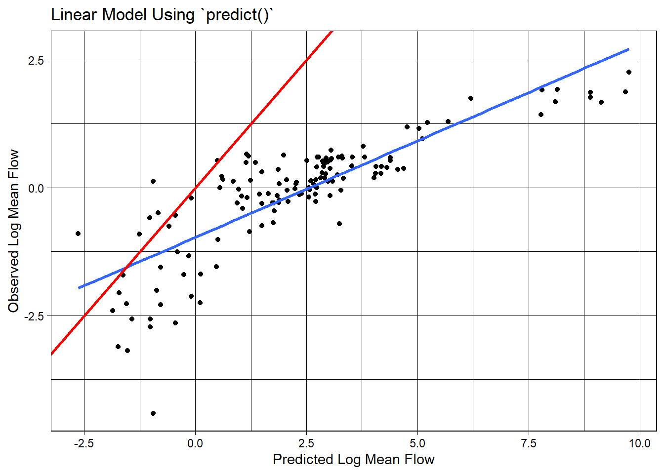 Results: rsq is 0.731, and the prompt called for an rsq above 0.9, so some work needs to be done to fit a better model or use different predictor variables. It seems that values above 0 logQmean are better fit. I will attempt to create a model of values of loqQmean > 0.