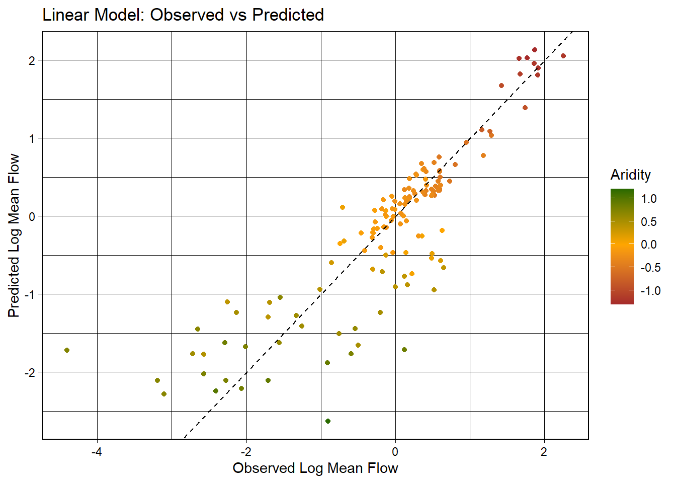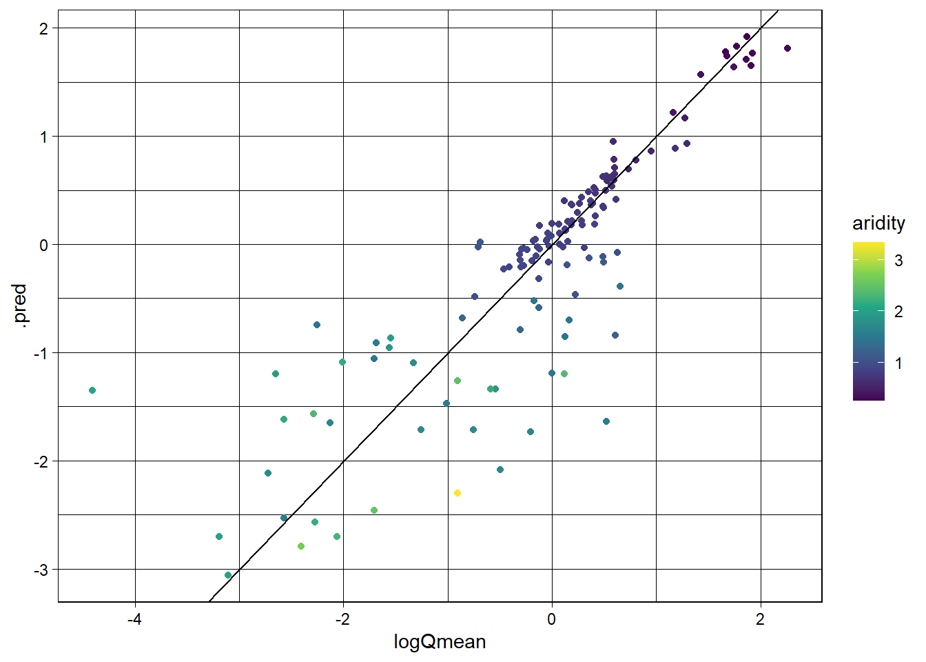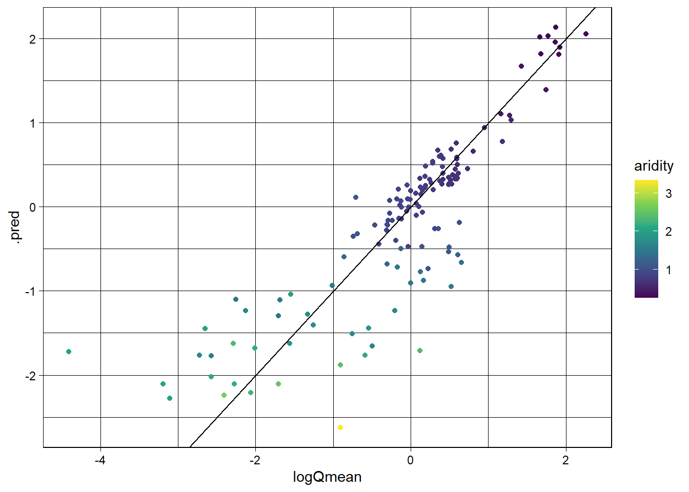 ggplot(final_rf_aug, aes(x = logQmean, y = .pred, colour = pet_mean)) +