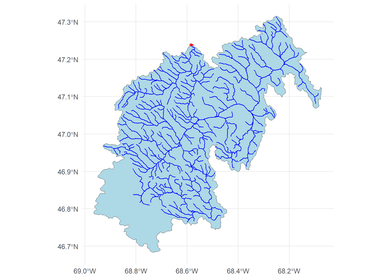 The data we are going to downloaded are the basin level summaries. For example, if we looked at row 1 of the data (Gage: 01013500) all of the values are the areal average for the drainage basin seen below, while the flow metrics are associated with the outlet gage (in red):