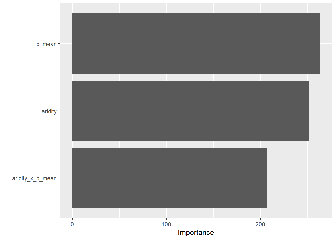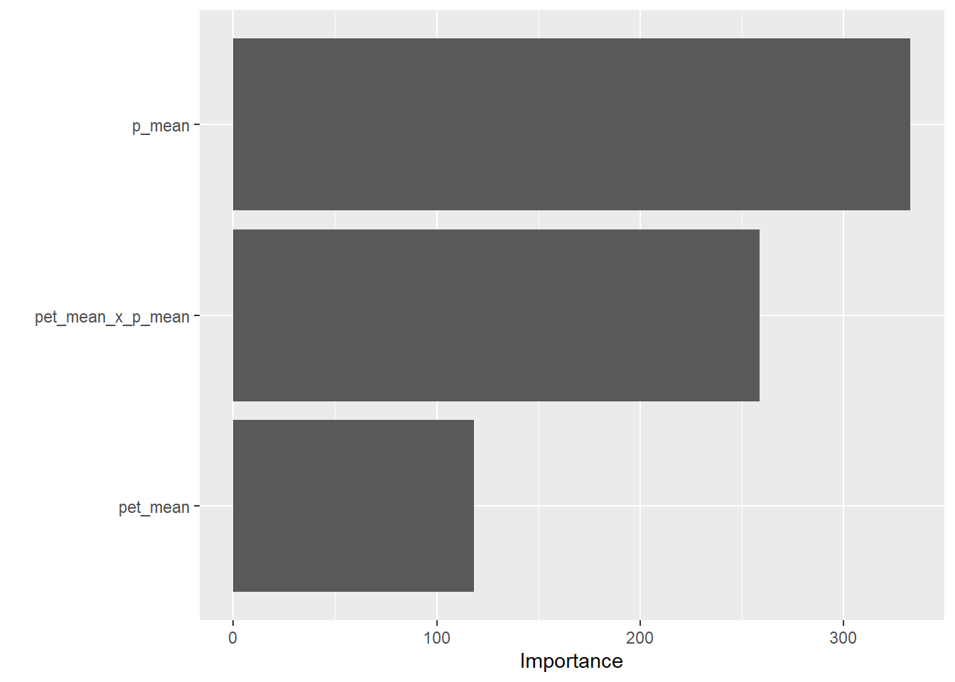 VIP shows that p_mean has the highest importance, then pet_mean x P_mean, and that pet_mean has the lease importance. This makes sense because precipitation will be of greater importance to streamflow than evapotranspiration, although both factors play a role in streamflow.